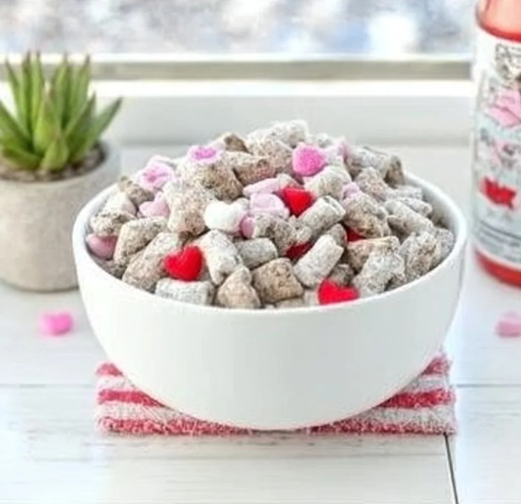 - Serve Cupid Chow in a vibrant bowl or package it into gift bags for sharing.